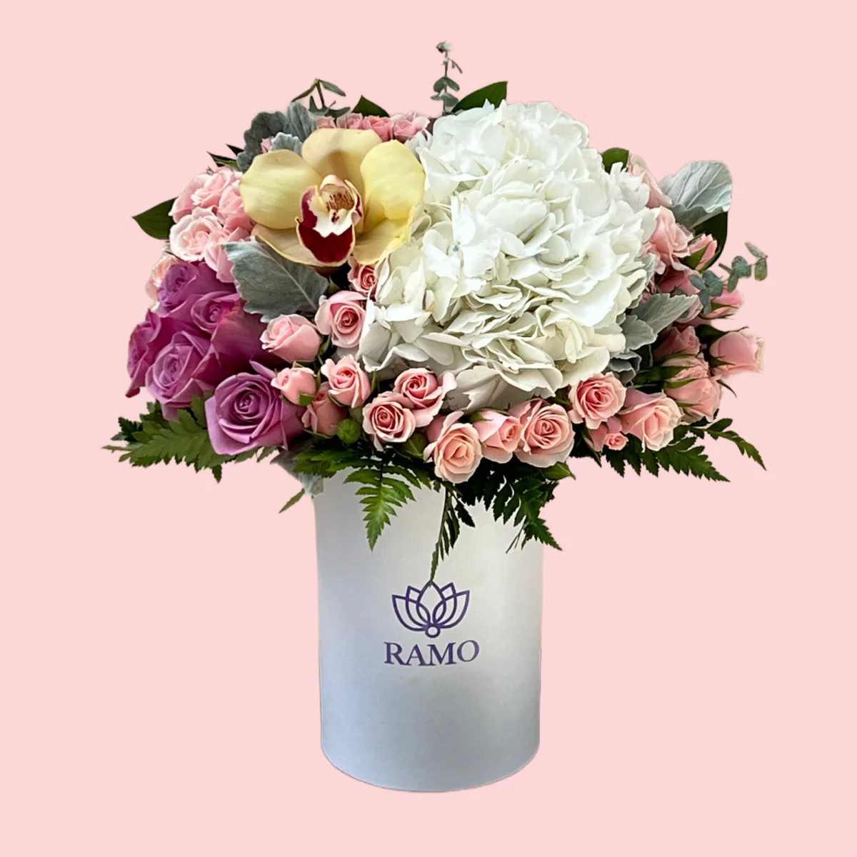 Delicada presentación en una box small con orquídea, hortensia, mini rosas y rosas. Tonos de acuerdo a stock.